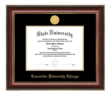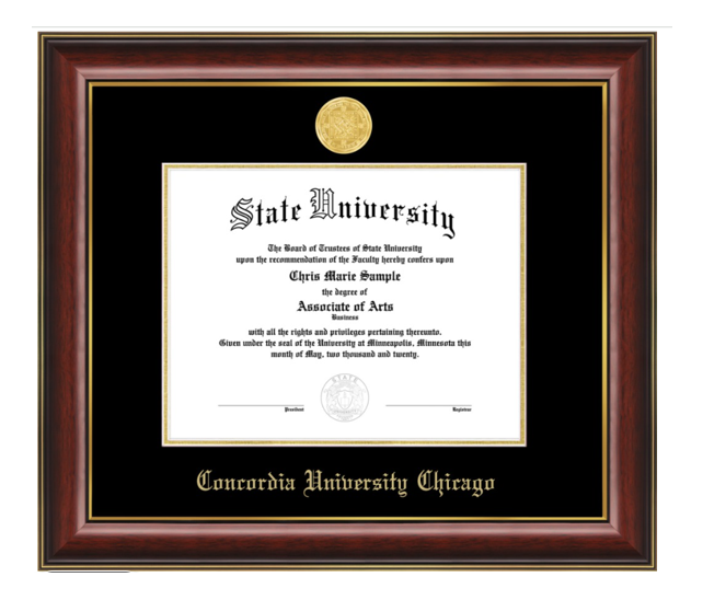 Classic Diploma frame. 1 3/4 inch mahogany molding with high-gloss finish and gold trim. Black mat with gold custom seal medallion. Fits 8 1/2 x11 diploma.